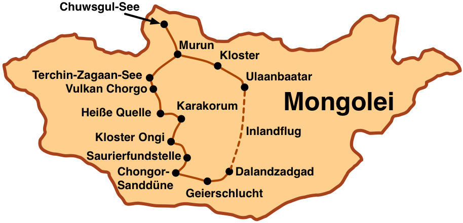 Gruppenreise, 22 Tage: Chuwsgul-See – Kloster Amarbayasgalant – Klosterruine Ongi – Chongor-Sanddüne – Vulkan Chorgo – Terchin-Zagaan-See – Heisse Zencher-Quelle – Hirschsteine – Kloster Erdene-Zuu – Geierschlucht – Saurierfundstelle Bayanzag (,,Flammende Klippen'') – Karakorum – ca. 4 Besuche bei Nomadenfamilien
